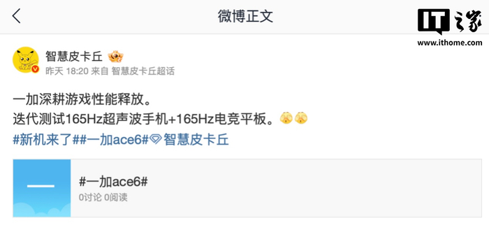 IT之家 6 月 11 日消息,博主“智慧皮卡丘”昨日于微博发文,称一加正在迭代测试“165Hz 超声波手机 + 165Hz 电竞平板”。