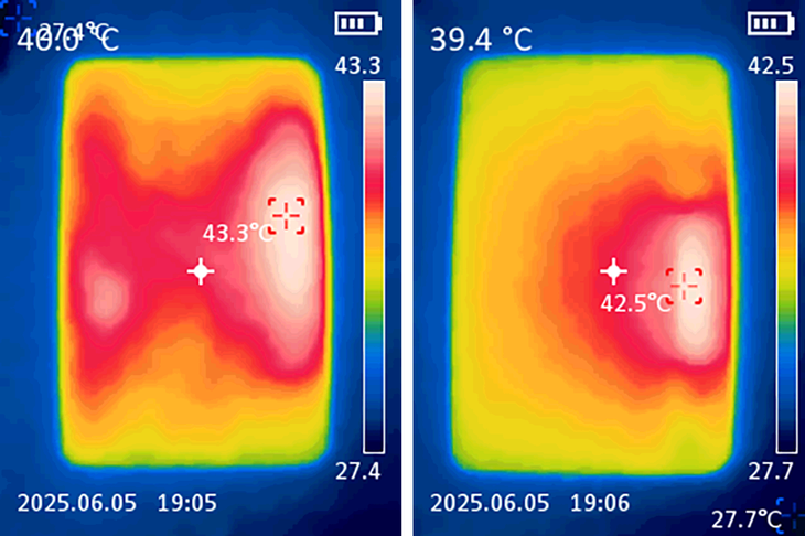 此外,在散热方面红魔电竞平板3 Pro也确实在同类型产品中有着非常优秀的表现。从上面游戏后测试的热感应图可以看到,温度最高的几乎都是位于上部中间的CPU。而红魔电竞平板3 Pro通过ICE魔冷散热系统,一方面采用行业首创双层夹芯 VC,芯片上下两块VC同时工作,快速散热;另一方面还在业内首次采用液态金属,有效提升CPU散热效率,提升性能,同时加速电池散热,充电效率提升13%;最后还有红魔招牌的主动式物理散热风扇,风扇转速高达20000r/min,也让平板的散热能力大幅提升。