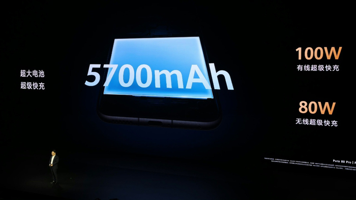 华为 Pura 80 Pro 系列及 Ultra 内置 5700mAh 电池,支持 100W 有线超级快充、80W 无线超级快充。