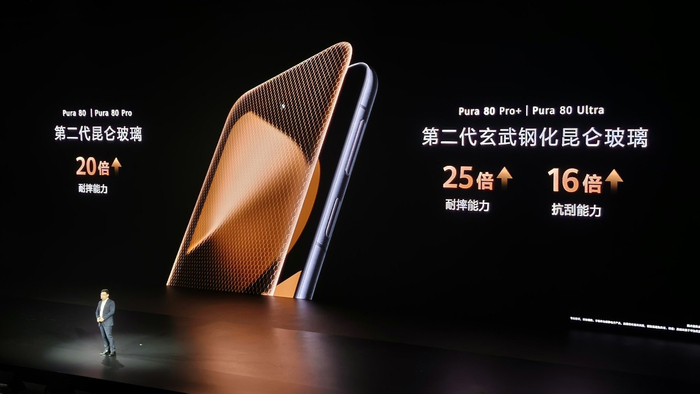 华为 Pura 80 Pro 屏幕采用第二代昆仑玻璃,整机耐摔能力提升 20 倍;Pura 80 Pro+/Ultra 屏幕采用第二代玄武钢化昆仑玻璃,进一步提升外屏的耐磨损、抗跌落能力,抗刮能力提升 16 倍,耐摔能力提升 25 倍。