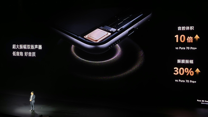 华为 Pura 80 Pro 系列及 Ultra 搭载超大振幅双扬声器,相较 Pura 70 Pro + 音腔体积提升 10 倍,振膜振幅提升 30%。