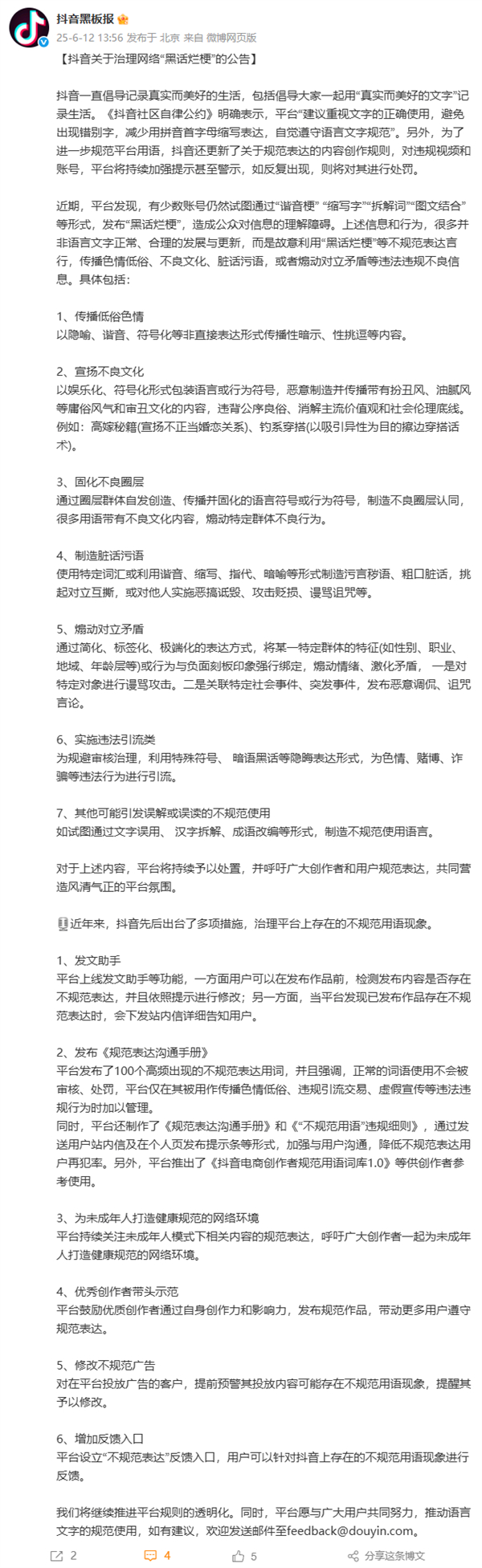 快科技6月12日消息,今日,抖音黑板报官微发布关于治理网络“黑话烂梗”的公告。