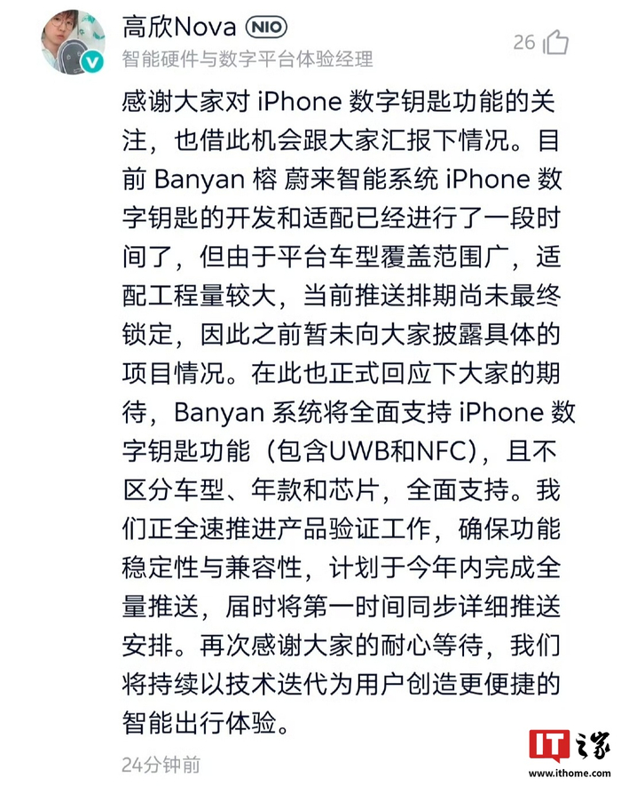 另外,蔚来智能硬件与数字平台体验经理 @高欣Nova 昨日在蔚来汽车 App 留言称:“目前 Banyan 榕蔚来智能系统 iPhone 数字钥匙的开发和适配已经进行了一段时间了,但由于平台车型覆盖范围广,适配工程量较大,当前推送排期尚未最终锁定,因此之前暂未向大家披露具体的项目情况。在此也正式回应下大家的期待,Banyan 系统将全面支持 iPhone 数字钥匙功能(包含 UWB 和 NFC),且不区分车型、年款和芯片,全面支持。我们正全速推进产品验证工作,确保功能稳定性与兼容性,计划于今年内完成全量推送,届时将第一时间同步详细推送安排。”