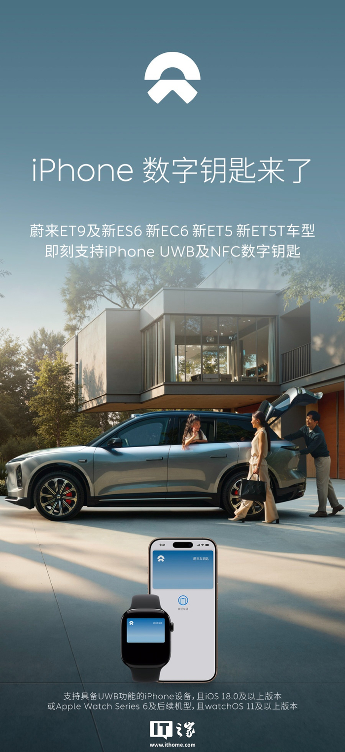 IT之家 6 月 12 日消息,蔚来官方昨日发文称,6 月 10 日,2025 苹果全球开发者大会(WWDC25)展示了蔚来、乐道等 20 多个品牌已支持 iPhone 数字钥匙,其中蔚来 ET9 及新 ES6、新 EC6、新 ET5、新 ET5T 这 5 款车型均已支持 iPhone 或 Apple Watch 的 UWB 及 NFC 两种数字钥匙。