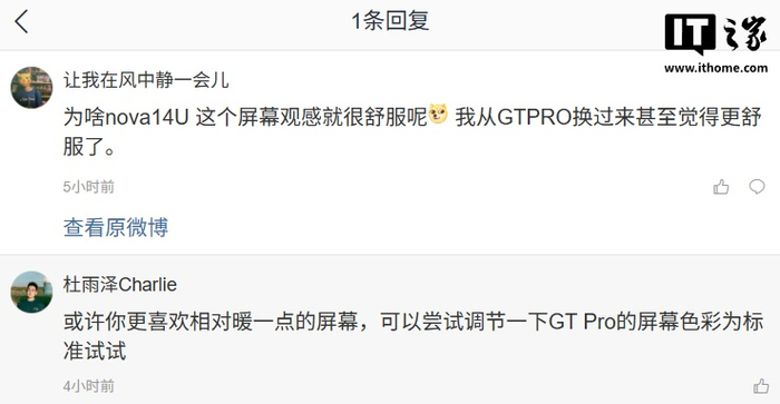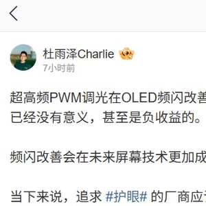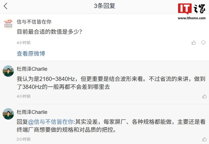 另外,杜雨泽还在微博评论区回复了部分用户的问题:针对目前最合适的数值是多少,他表示“我认为是 2160~3840Hz,但更重要是结合波形来看。不过省流的来讲,做到了 3840Hz 的一般再都不会差到哪里去”;针对其个人更喜欢哪家屏幕厂商的方案,他回复“其实没差,每家屏厂、各种规格都能做,主要还是看终端厂商想要做的规格和对品质的把控”。