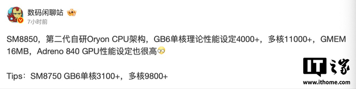 博主 @数码闲聊站 今日透露,下一代骁龙 8 至尊版处理器(代号 SM8850)将采用第二代自研 Oryon CPU 架构,其 Geekbench 6 单核理论设定超过 4000 分,多核超 11000 分,GMEM(图形内存)达 16MB。