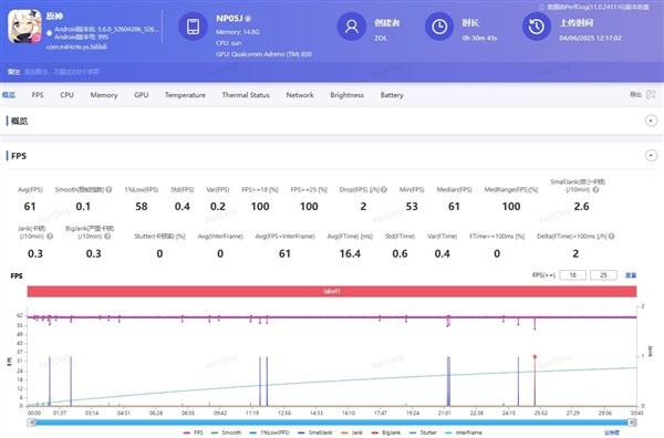 跑分并不是炫技,而是极致性能体现,同时也为了实战的“稳”和“顶”。游戏体验是这台平板的核心亮点,我们实测了《原神》《崩坏:星穹铁道》和《王者荣耀》三款热门手游,其中《原神》在自定义极高+60帧模式下,半小时平均帧率达到了61 FPS,跑图打怪都非常流畅,帧率曲线几乎贴着直线走。