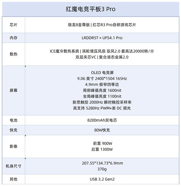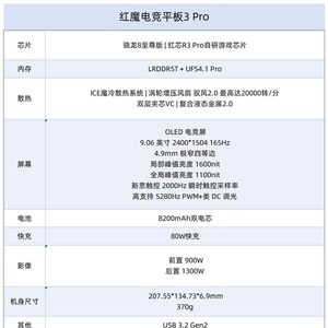 最近两年,“小直屏”在手机圈着实火了一把,不知不觉,这股新潮设计风也刮到了平板圈。红魔电竞平板3 Pro搭载了一块2400 x 1504 165Hz OLED屏幕,屏幕尺寸仅9.06英寸,属于妥妥的“小平板”范畴。