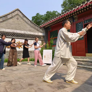 6月12日,北京非遗体验中心,中外大学生跟着王其和太极拳非遗传人杜军明学太极拳。新京报记者 浦峰 摄