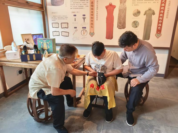 穿过正房,便来到东耳房,何凯英、任晨阳、刘健师徒三人展示的是内联升千层底布鞋的制作技艺,任晨阳也是新入选的市级非遗传承人之一。