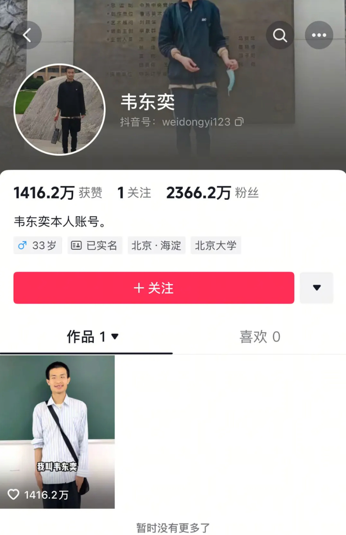 就这样,在抖音算法的推动下,韦东奕的视频迅速传播开来,引发了裂变式的关注。他的粉丝量呈指数级增长,短短几天就成为了抖音上的超级顶流。
