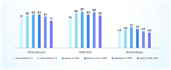 再比如,数学测评AIME25成绩达到86.3分,相比豆包1.5深度思考模型大幅提升12.3分。