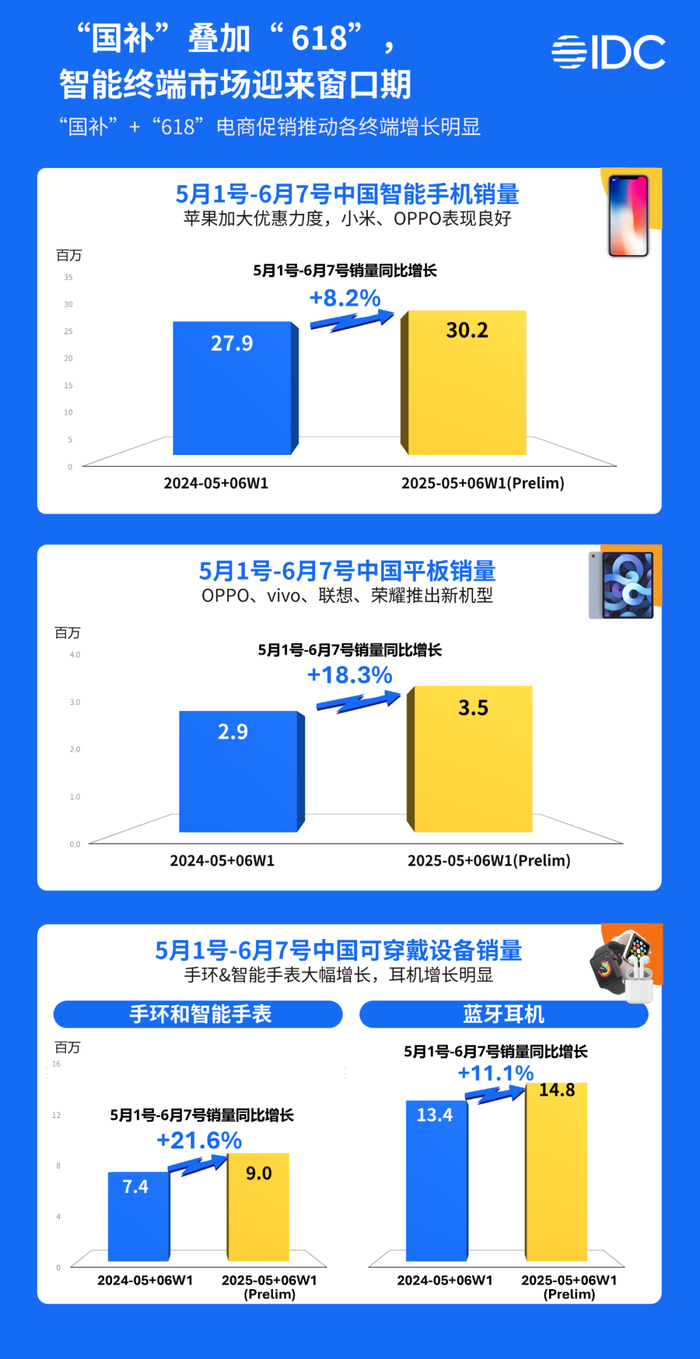 “618”即将到来,国内智能终端(消费电子)市场迎来售卖高峰。与往年不同的是,今年“618”恰逢国家政府补贴,智能手机、平板、智能手表等品牌厂商,纷纷推出了更大幅度优惠。OPPO、vivo、联想、荣耀等品牌趁势推出新机型,刺激市场需求。政府、平台、厂商合力推动下,“618”前期智能终端市场增长提速,呈现出一片繁荣景象。