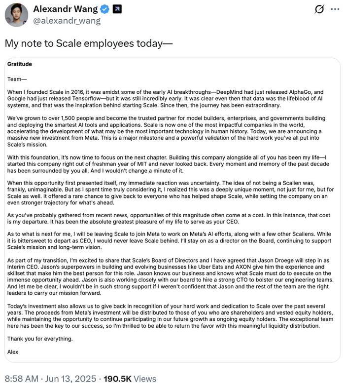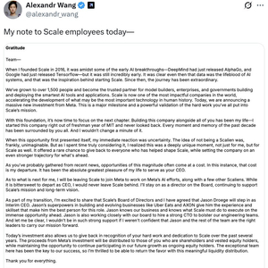 就在刚刚,Alexandr Wang 在 𝕏 发布了一份公开信,正式确定了这一消息。