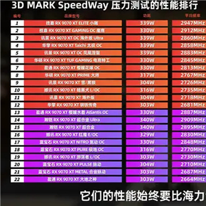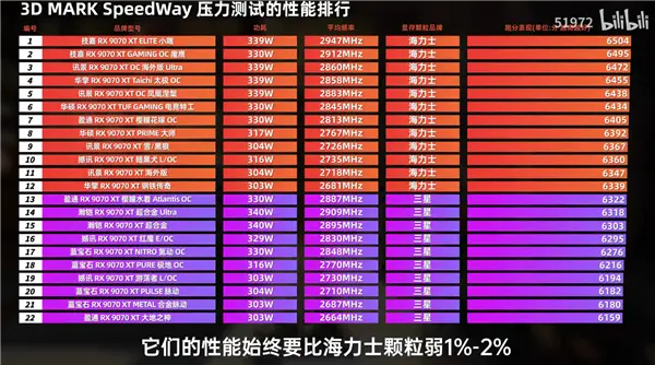 在其最新发布的22款RX 9070 XT显卡横评测试视频中,结果也证实了这一点,在3D Mark SpeedWay压力测试中,所有排名靠后的显卡,均为三星显存颗粒。