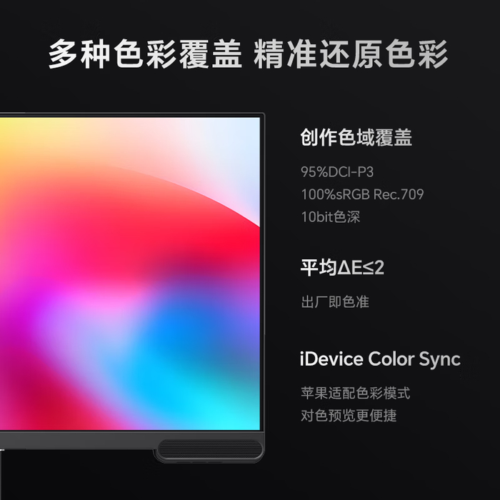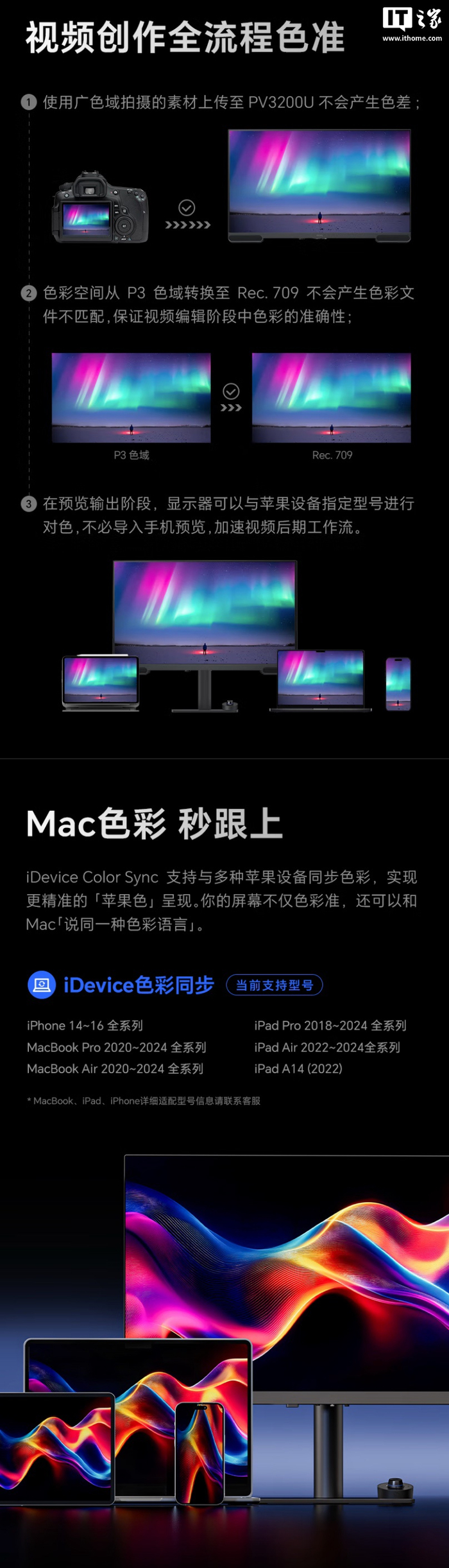官方强调,该机可实现“视频创作全流程色准”,同时拥有 iDevice Color Sync 色彩同步技术,号称可以精准呈现苹果 Mac 色彩,统一笔记本和显示器的色彩效果。
