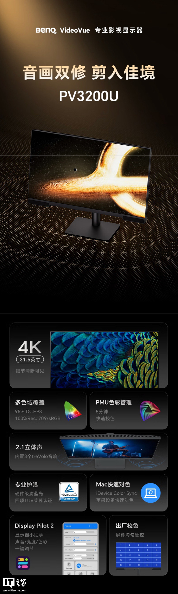 明基推出“PV3200U”31.5 英寸显示器:4K 60Hz 匹配苹果 Mac 色彩、3 扬声器,4999 元