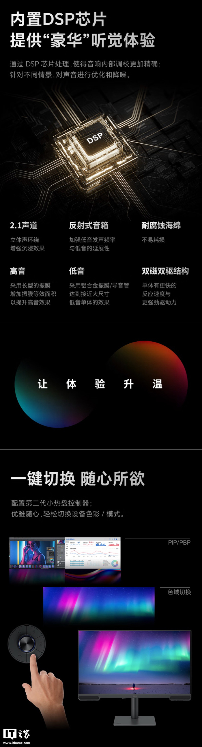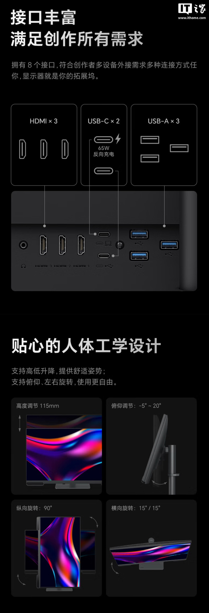 其他方面,该机号称内置 DSP 芯片,匹配 3 扬声器,支持 2.1 声道立体声,显示器支架支持升降 / 倾斜 / 旋转,提供 3 个 HDMI 接口、1 个 USB-C 65W 接口、1 个 USB-C 接口(具体规格未标)、3 个 USB-A 接口(KVM)。