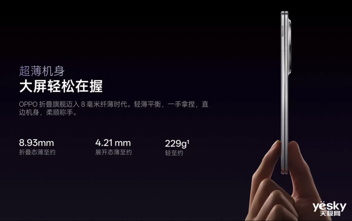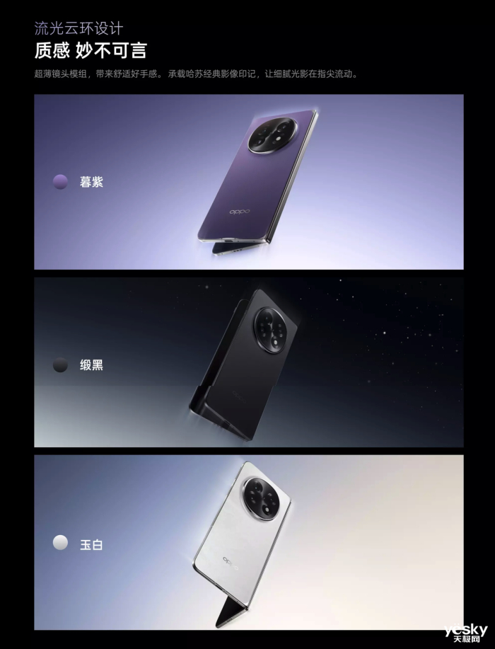 配色方面,Find N5共提供缎黑、玉白、暮紫三种风格各异的选择。其中,缎黑与玉白版本整机重量约229克,折叠状态下厚度约为8.93mm,展开后最薄处约为4.21mm,在轻薄程度上与苹果直板旗舰iPhone 16 Pro Max不相上下。尤其值得一提的是暮紫配色,其后盖采用高品质素皮材质,具备防指纹、抗污渍特性,搭配柔和的莫兰迪色调与细腻的触感,深受女性用户青睐。