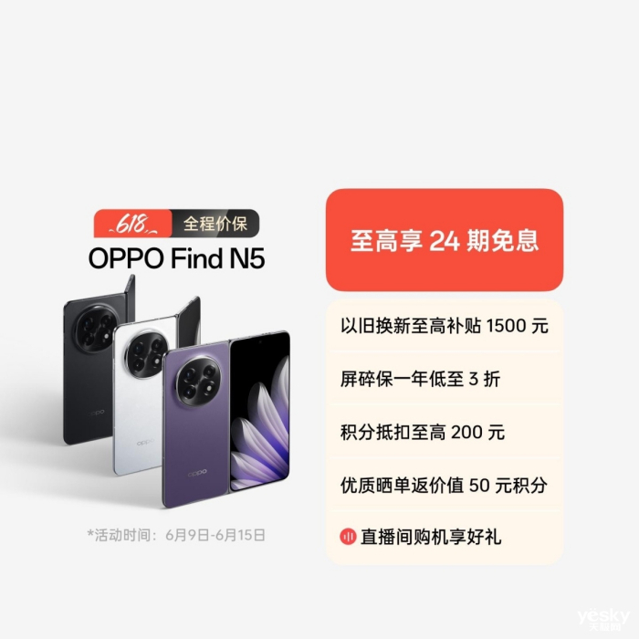【天极网手机频道】随着618年中大促全面开启,换新机成为不少消费者的热门选择。尤其对于追求高端质感与前沿科技的用户来说,折叠屏无疑是近年来最具吸引力的产品形态之一。今天小编就为大家带来一款兼具轻薄设计与强劲性能的热门折叠旗舰——OPPO Find N5,目前某东线上平台购机立享500元起优惠,机会难得,一起来看看吧。