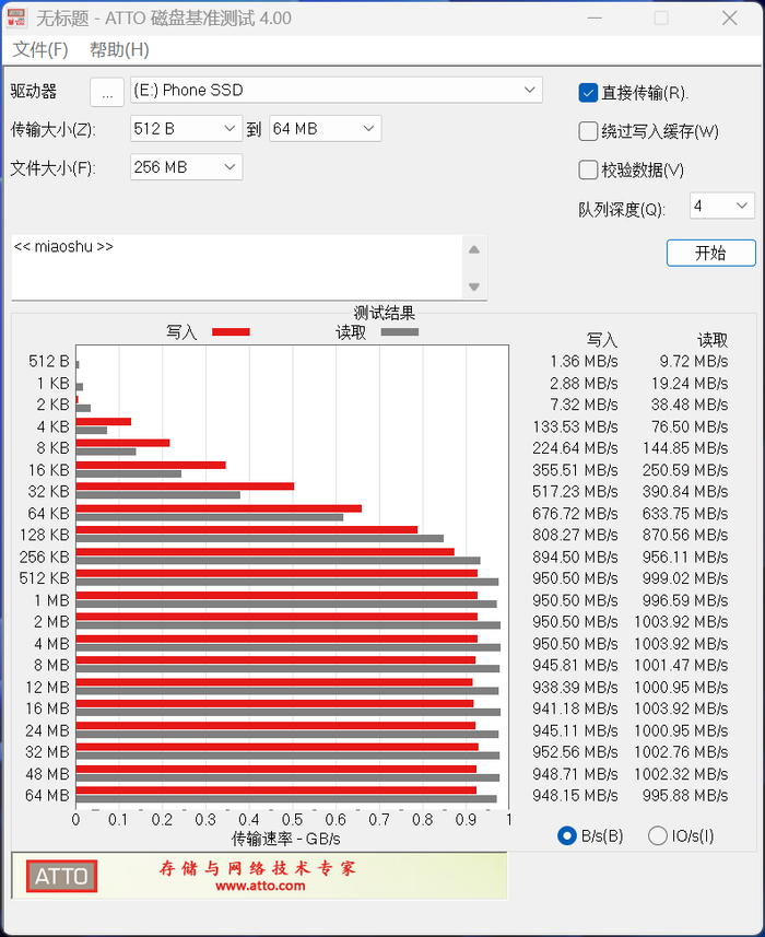 在ATTODiskBenchmark的测试中同样表现出色,8KB的文件读写速度就达到了144MB/s和224MB/s,在文件容量达到512KB之后读写速度就超过了1000MB/s和950MB/s,无论是碎片文件还是大型文件都有非常快的相应速度。