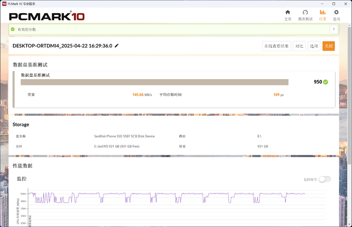 最后是PCMARK10的数据盘基准测试,它的带宽为145.66MB/s,平均存取时间为169微秒,获得950分,在移动存储设备中算是优秀的成绩。