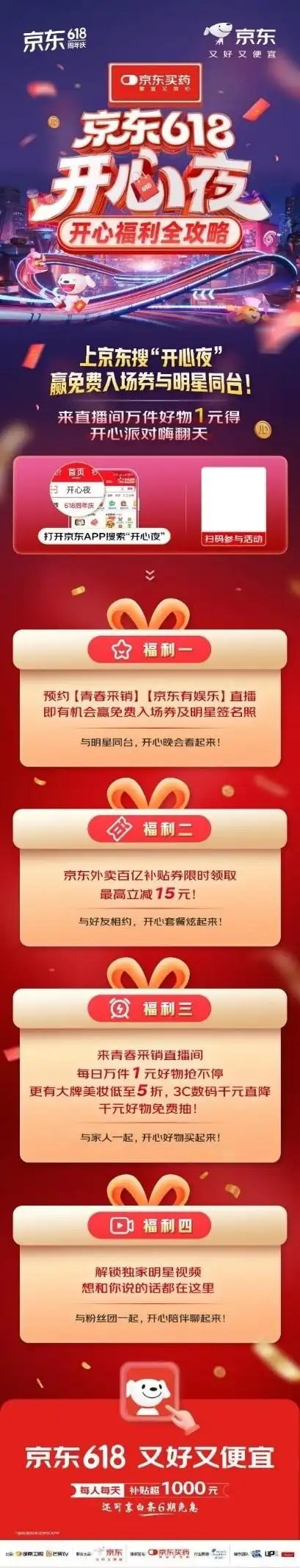 除了精彩的节目表演,《京东 618 开心夜》还为观众准备了丰厚的福利。即日起,打开京东 App 搜索 “开心夜”,预约 “青春采销”“京东有娱乐” 直播,即可解锁明星独家视频,更有机会赢取晚会免费入场券与明星签名照,与心仪的明星近距离接触。