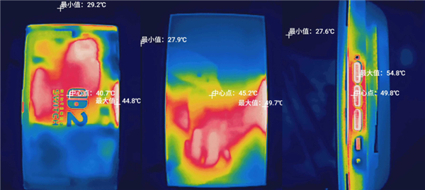 随后又玩了马车世界等游戏,持续较长时间的底座模式运行,外壳温度始终在 40-50° 这个区间,出风口处温度会高一些,达到 54.8°C。