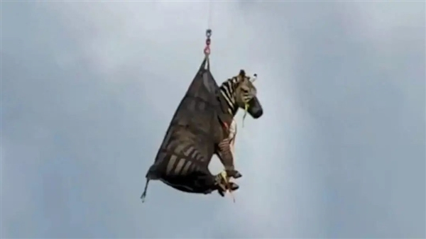 当时使用的是网捕,就是把网直接撒在动物身上,将其控制住后,再将斑马“打包”挂在直升机上送回主人处。