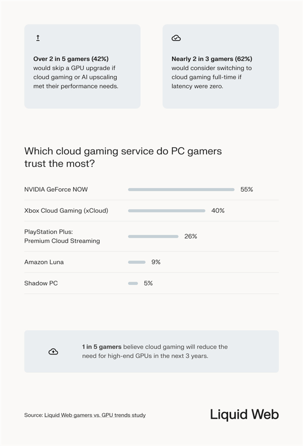 调查显示,如果云游戏能够消除延迟问题,62%的玩家愿意完全转向云游戏,42%的玩家表示,如果AI技术或云服务能够满足他们的性能需求,他们将完全跳过未来的显卡升级。