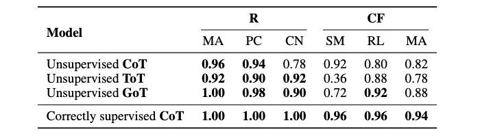 研究还考察了不同的 CoT 变体,如思维树(ToT)和思维图(GoT)等(见表 2)。结果显示,这些方法能在一定程度上提升朴素 CoT 的性能,例如 GoT 因其自我修正机制表现出较好的准确率增益。