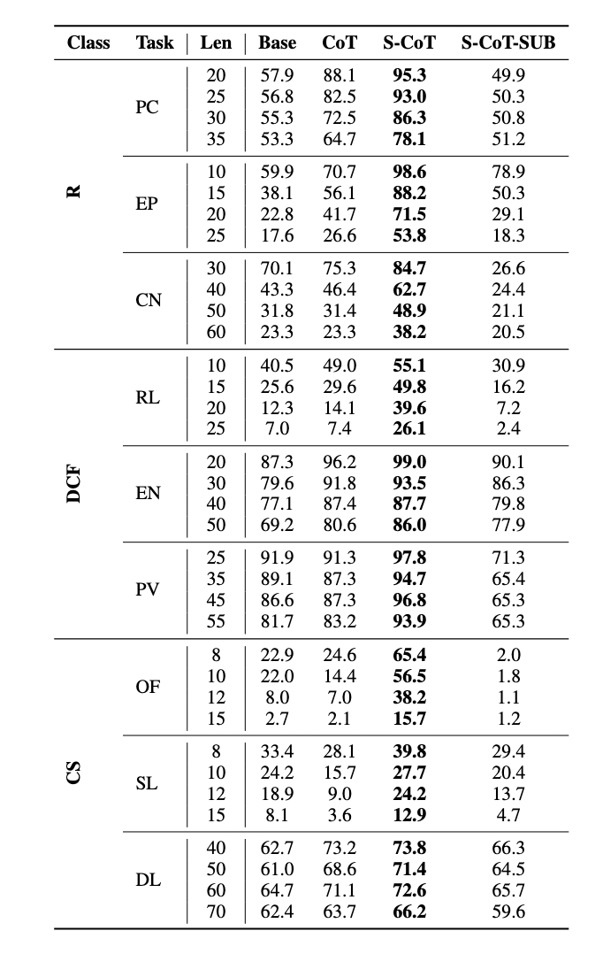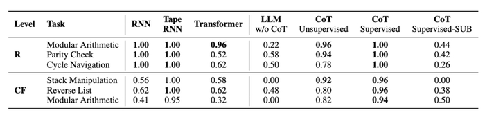 为了验证上述理论框架的有效性,研究团队进行了一系列精心设计的实验。他们选取了涵盖不同计算复杂度等级(包括常规 Regular、上下文无关 Context-Free 及上下文敏感 Context-Sensitive 等)的基础推理任务,这些任务本身对计算深度有较高要求,通常超出标准 Transformer 架构的直接处理能力,因而非常依赖 CoT 机制来辅助完成。实验中使用了 gpt-4o-classic 网页版及 gpt-4o mini API,并特别注意通过统一输入格式(如将字符串任务转换为列表格式)等方式,来最小化 Tokenization 等外部因素对实验结果的干扰。