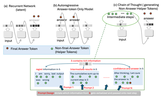 :CoT 通过生成非答案的辅助 Token(中间步骤),近似了循环网络的计算方式。模型内部隐藏状态 h 中蕴含的丰富信息(如先前的错误、中间结果、置信度等)可以通过不同的 Prompt 设计被选择性地提取并言语化。