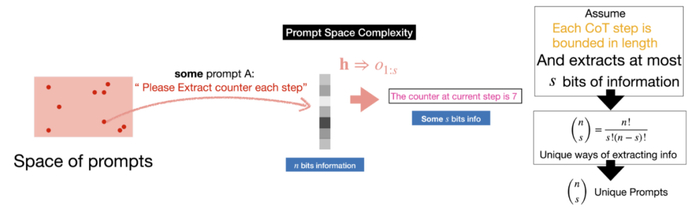 一个精心设计的提示模板,就如同一个精确的导航仪,它明确地指示模型在 CoT 的每一步中,应该从其完整的隐藏状态 h 中「选择」并「提取」哪些与任务最相关的信息进行「言语化」(verbalization)输出。这一选择过程的复杂性,即「Prompt 空间复杂度」,如论文图 5 所示,取决于隐藏状态 h 中总信息量 n 以及每个 CoT 步骤能提取的信息量 s。
