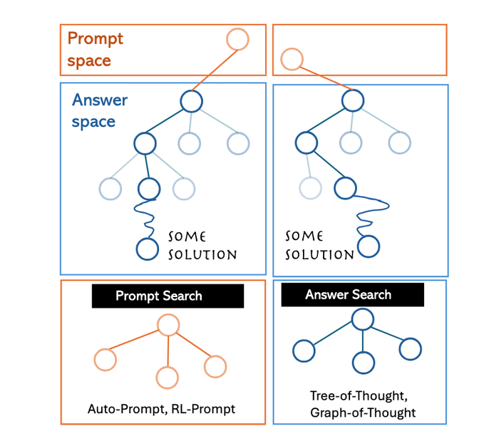 :Prompt 模板深刻影响着答案空间的配置和导航方式。左侧展示了不同的 Prompt(如 Auto-Prompt、RL-Prompt)如何在「Prompt 空间」中进行搜索,而右侧则展示了在特定 Prompt 指导下,如何在「答案空间」中进行搜索以得到解决方案(如 Tree-of-Thought、Graph-of-Thought)。