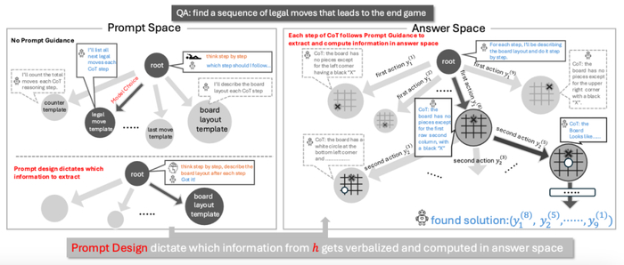 :CoT 的整体空间可以分解为「Prompt 空间」和「答案空间」。在 Prompt 空间中选择不同的 Prompt 设计(例如,决定在象棋推演的每一步是提取「棋盘布局」还是「剩余棋子数」),会直接影响在答案空间中导航并找到解决方案的路径和效率。