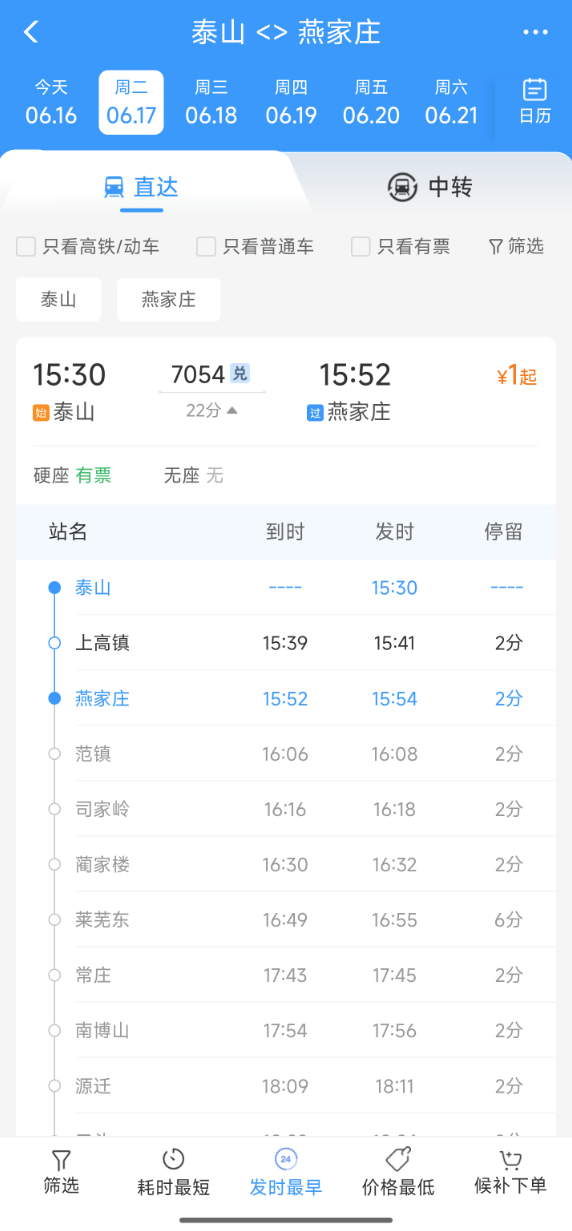 并且,该次列车的票价为1元起,从泰山站出发,基本上两个车站叠加1元票价。例如,泰山至燕家庄票价1元、泰山至司家岭站2元、泰山至莱芜东票价3元等。