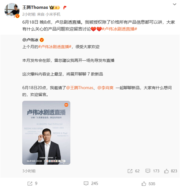 卢伟冰宣布618开剧透直播:在线爆料REDMI K80至尊版等7款重磅新品