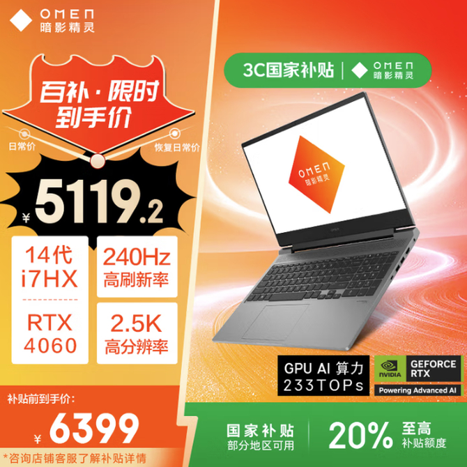 618质价比拉满的游戏本!暗影精灵乐享版 i7+RTX4060仅5119.2元