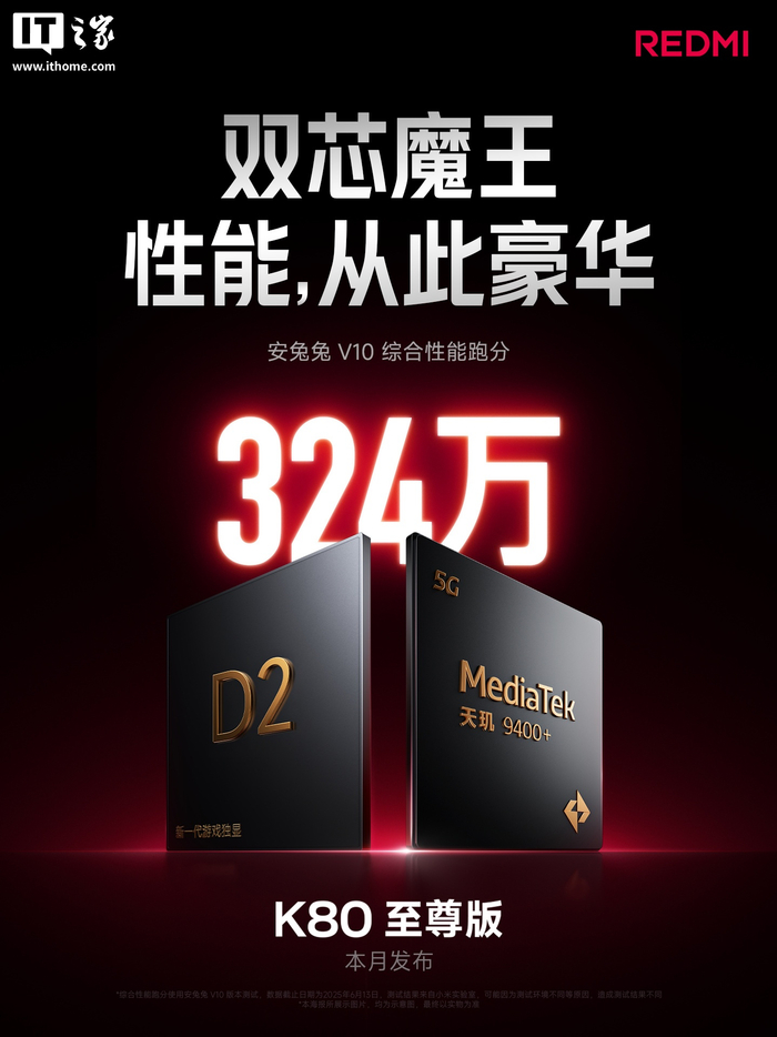 小米 REDMI K80 至尊版手机首发独显芯片 D2、配天玑 9400+ 芯片,跑分破 324 万