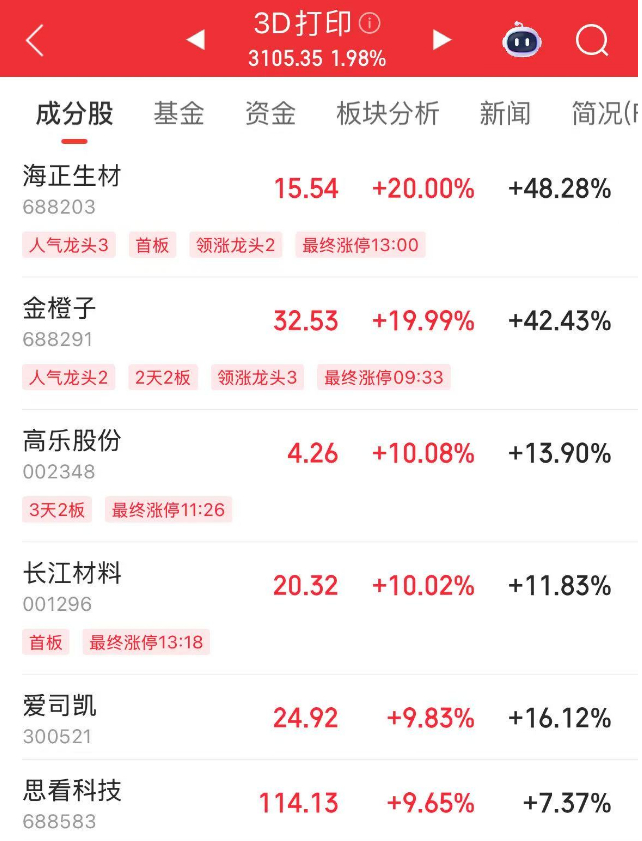 红星资本局6月16日消息,今天A股盘中,3D打印概念板块出现异动拉升,金橙子(688291.SH)开盘3分钟斩获“20CM”涨停,午后海正生材(688203.SH)也收获20CM涨停。