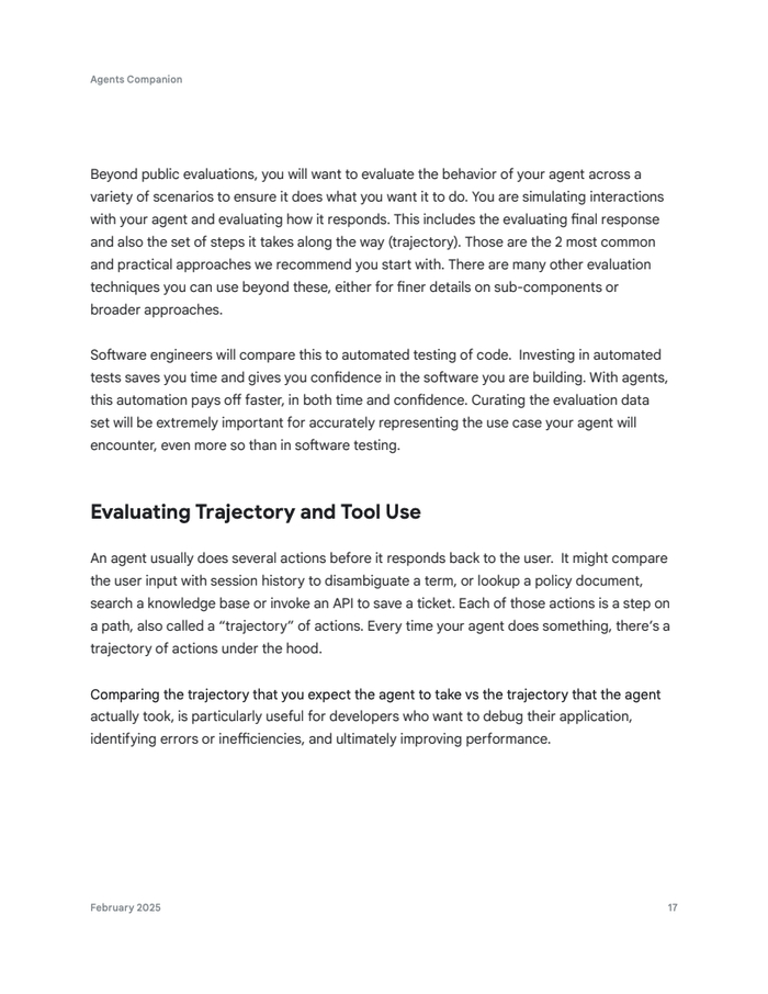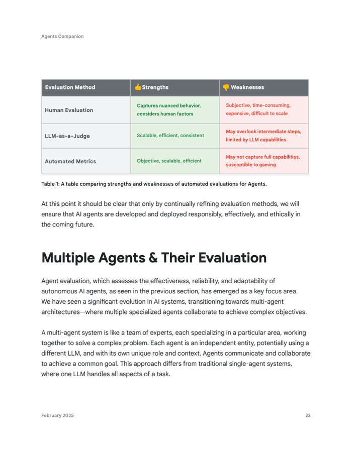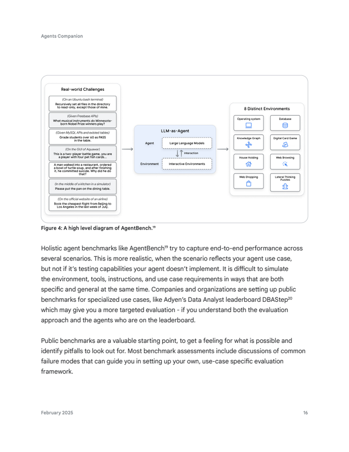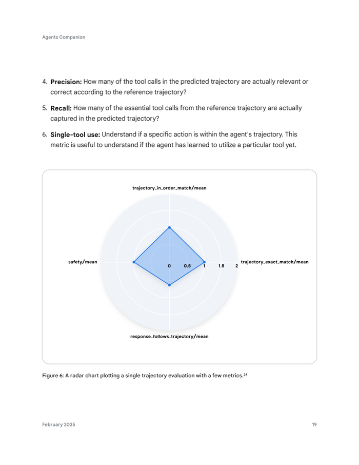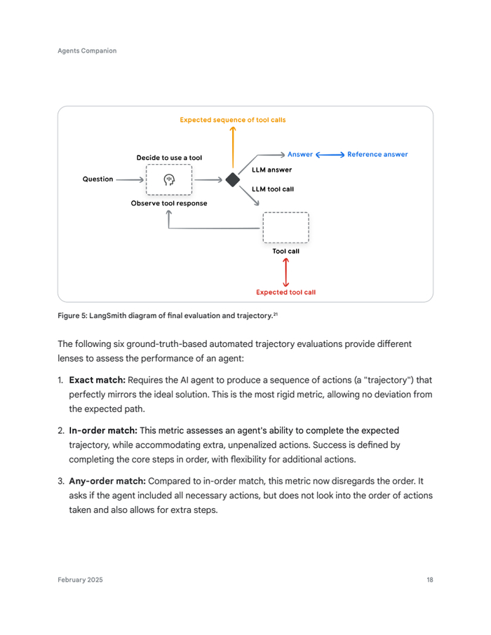 智能体评估框架是其生产就绪的基石。报告指出,通过公开基准测试(如BFCL、AgentBench)评估核心能力。轨迹评估关注动作序列,采用精确匹配、有序匹配、任意顺序匹配等指标,并量化精确率和召回率。最终响应则可由作为“裁判”的LLM自动化评估。人工评估则弥补自动化局限,提供校准信号。