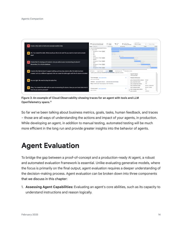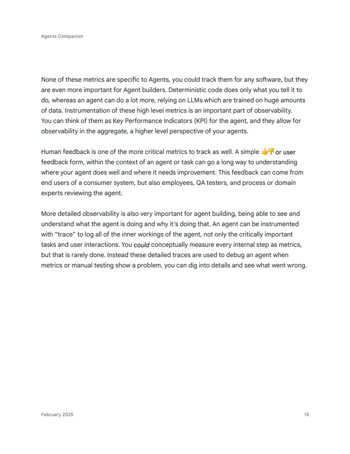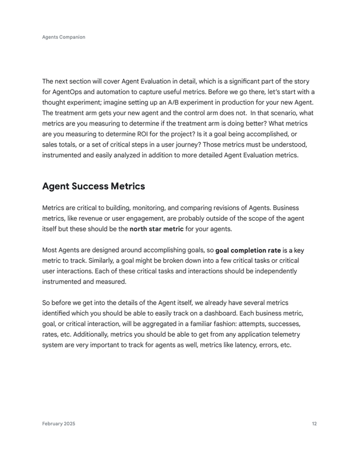 衡量智能体成功的核心在于业务与技术指标的融合。业务“北极星”指标,如收入或用户参与度,是最终衡量标准。同时,智能体目标完成率、任务达成率以及应用遥测指标(如延迟、错误率)至关重要。人类反馈(“顶/踩”)和详细追踪(trace)提供深度可观测性,确保数据驱动的持续优化。