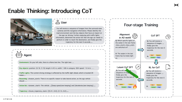 今年 4 月,小鹏汽车首次披露了自身的下一代自动驾驶基座模型。该云端基础模型参数规模达到 720 亿,目前训练数据已超过 2000 万条视频片段(每条时长 30 秒)。它以大语言模型为骨干,使用海量优质多模态驾驶数据进行训练,具备视觉理解、链式推理(CoT)和动作生成能力。通过强化学习(RL)后训练,它可以不断自我进化,逐步发展出了更全面、更拟人的自动驾驶技术。