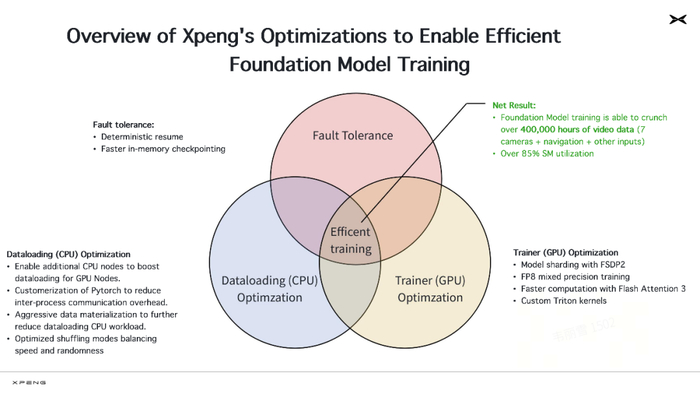 前者验证了小鹏的数据处理能力,后者是指 GPU 的核心计算单元的运行效率,是评判计算资源使用效率的重要指标。据业内人士评估,85% 的利用率数字基本摸到了行业天花板,在大模型圈内也属于顶尖水平。