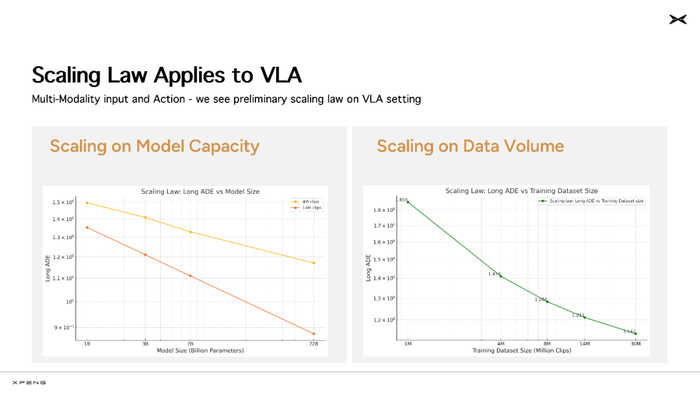 其实小鹏此前在构建智驾系统时,也清晰地观察到了 Scaling Laws 显现。他们是大模型浪潮以来,行业内首个基于大规模量产车队和海量真实用户数据,对自动驾驶 Scaling Laws 做出验证的研发团队。