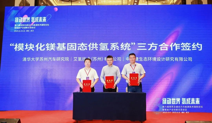 为进一步推动固态储氢技术创新与产业化应用,清华大学苏州汽车院与艾氢技术(苏州)有限公司、中电建生态环境设计研究有限公司在论坛现场正式签署战略合作协议。三方将围绕“模块化镁基固态供氢系统”开展深度合作,实现技术突破与产业落地,共同推动中国氢能产业的高质量发展,助力国家“双碳”目标实现。