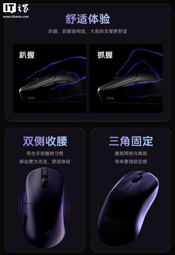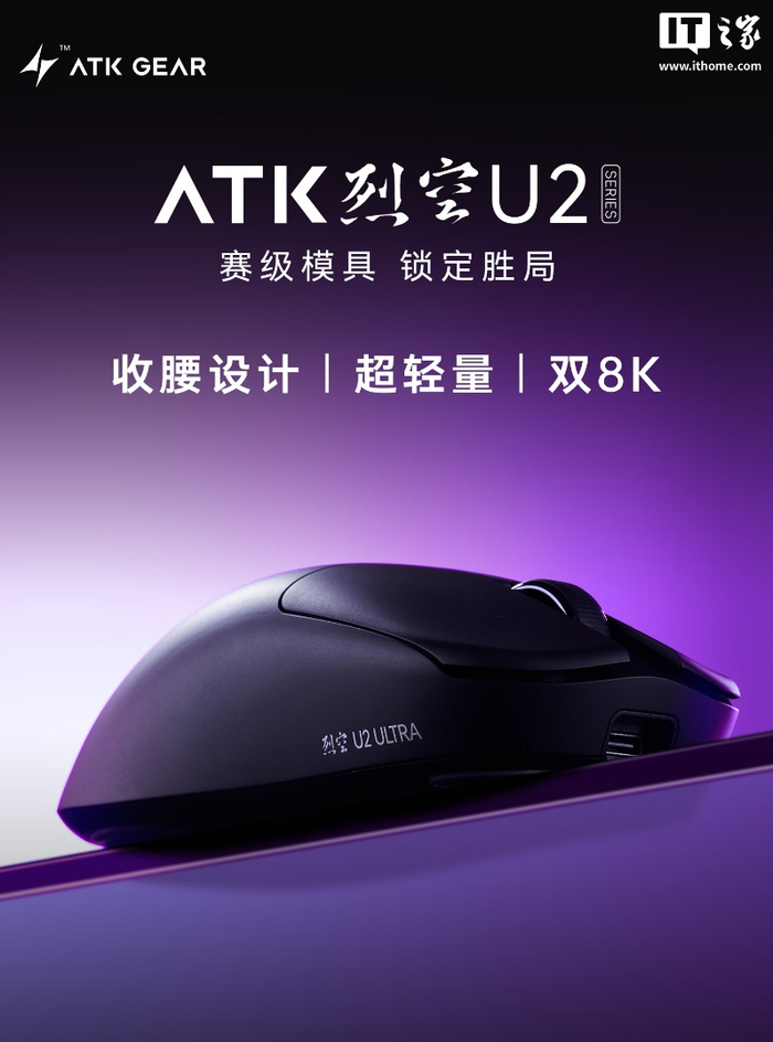 ATK 烈空 U2 系列采用收腰设计 + 轻量化设计 + 冰感涂层,同样适合中大手用户,预装 ATK 绝鲨竞技固件,重量甚至降到了 49 克左右,定价同样为 89 元起。