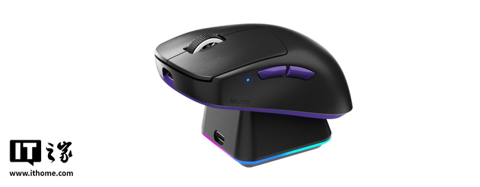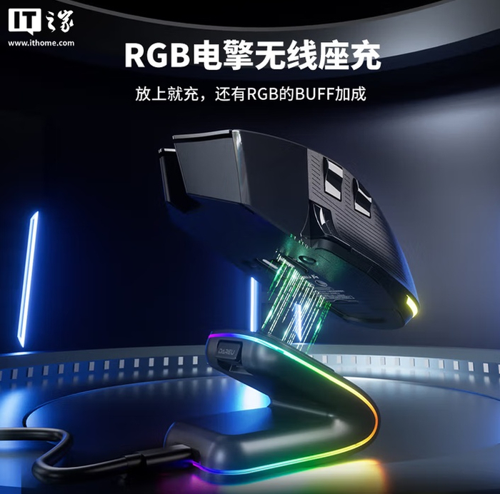 达尔优 A980 Pro 电擎版星闪鼠标还配有欧姆龙微动,采用镀金触点材质,按键寿命约 1 亿次;官方提供 RGB 磁吸充电底座,内置 5 种灯效,支持信号延长。
