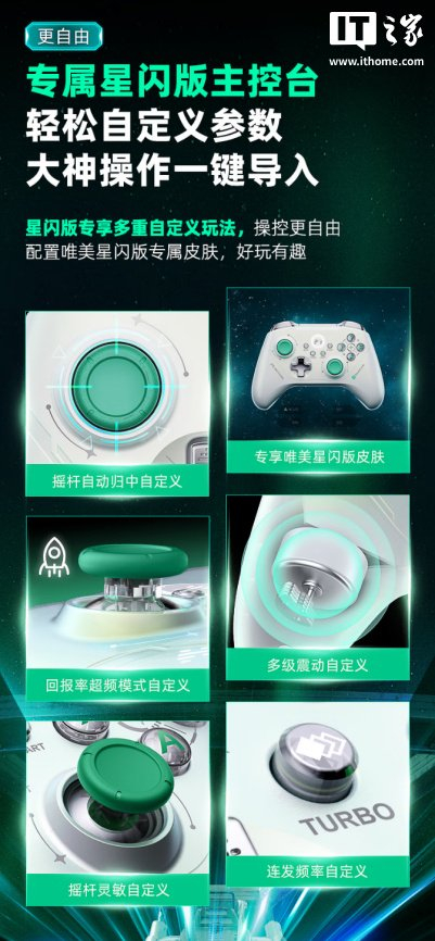 这款手柄还支持沉浸式震动 2.0、六轴体感、0.1mm 精度霍尔扳机;适配 PC、手机、Switch 主机等多平台,还有星闪 / 蓝牙 / 有线三模连接;支持专属按键自定义功能,采用特殊定制皮肤。